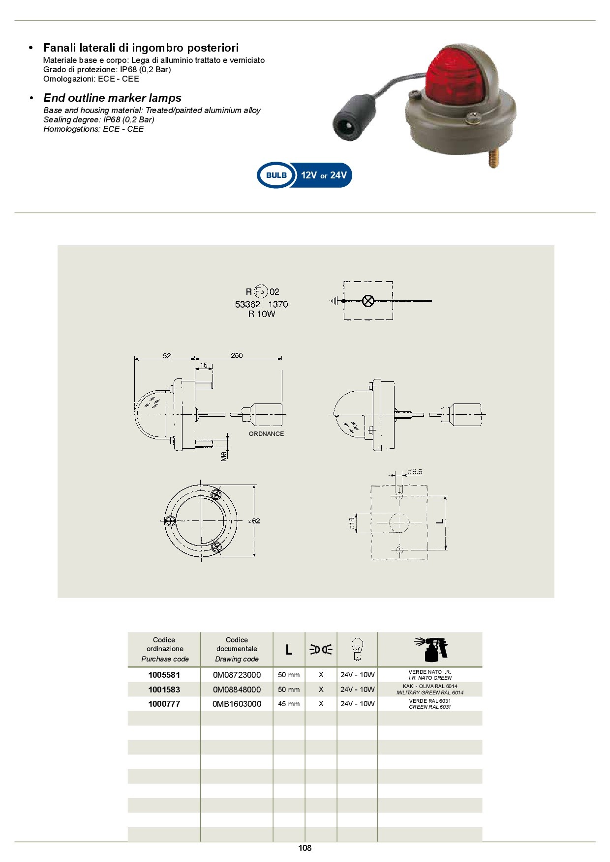-COD.DOCUMENTALE 0M08848000, Codice ORDINAZIONE 1001583, L 50 mm, posizione, lampada 24V - 10W, colore KAKI - OLIVA RAL 6014
